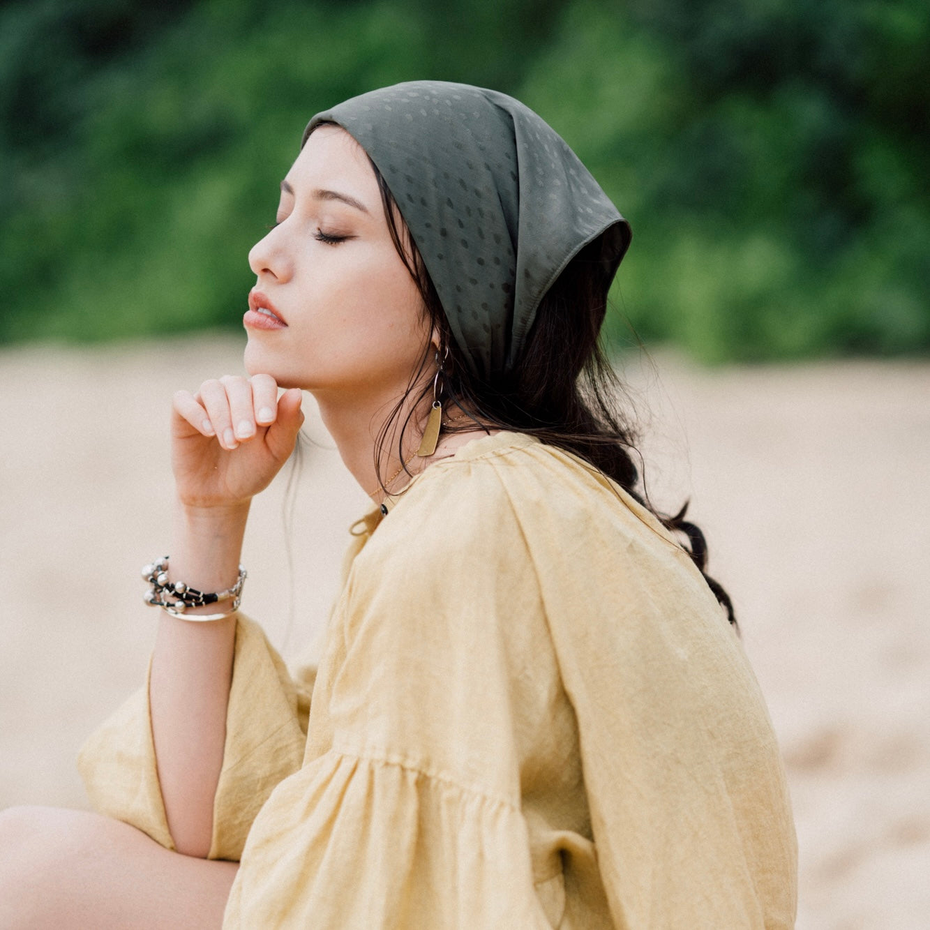 三角に折って頭に巻いたり、ヘアバンドのように使ったり、