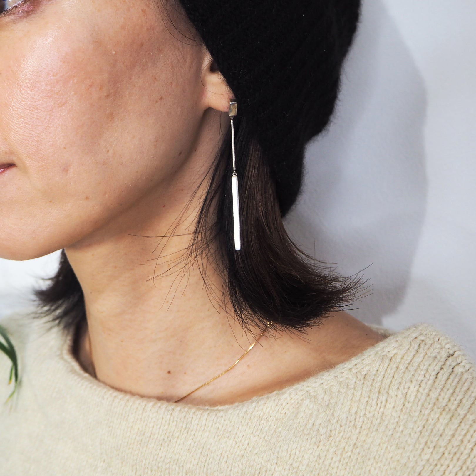 スネークチェーンで繋がれたスクエアのLineパーツがとても面白い揺れ方をするピアスです。