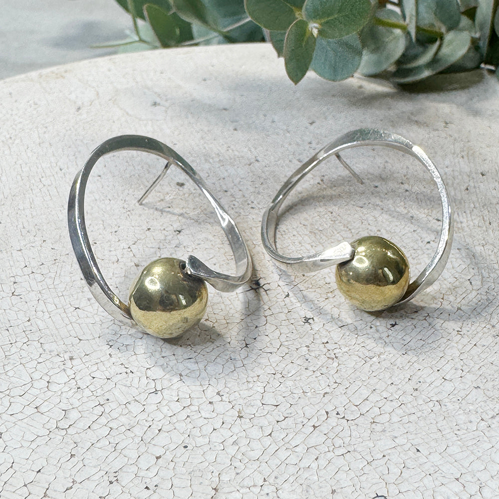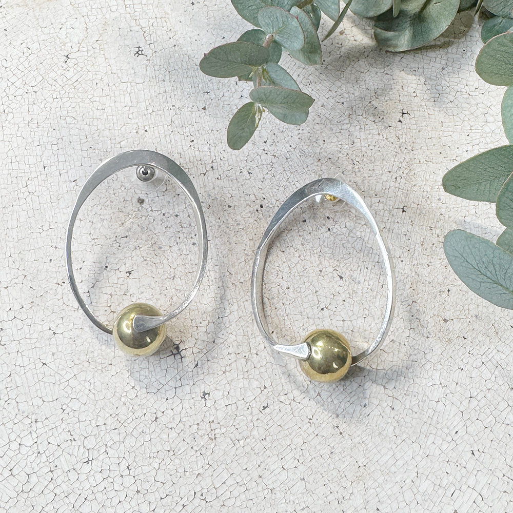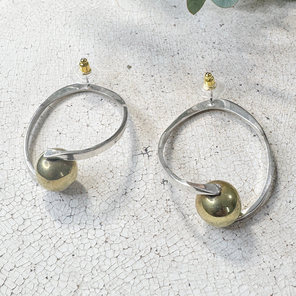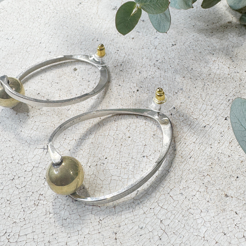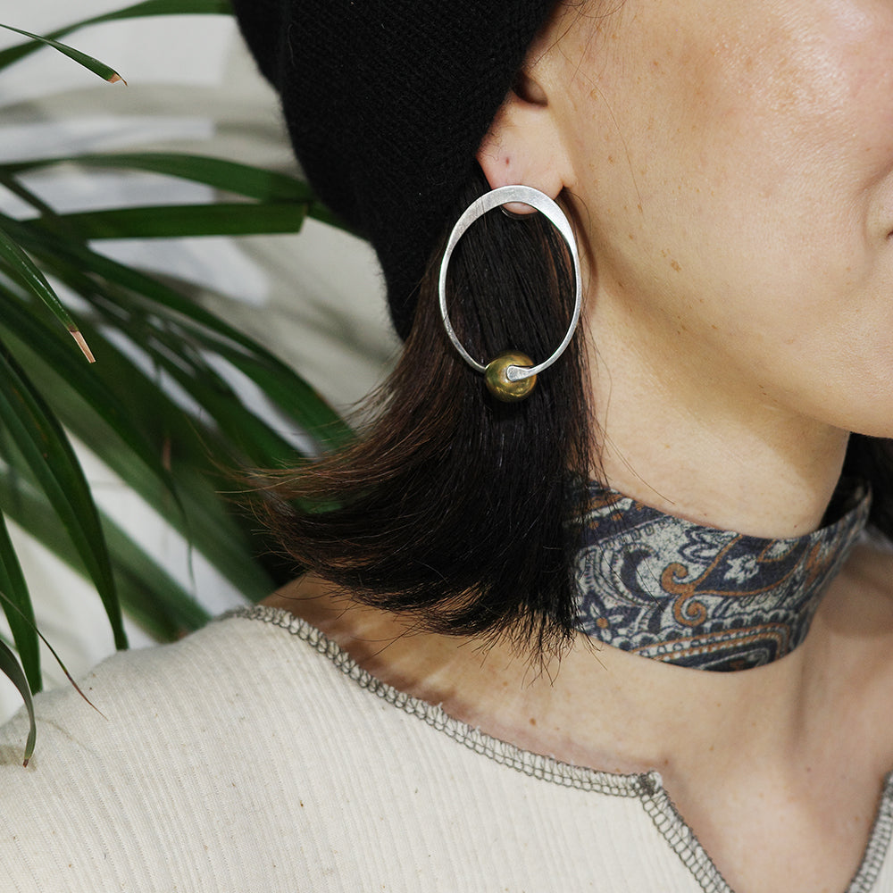 シルバーの変形フープに真鍮のボールがついたポストタイプのピアス。