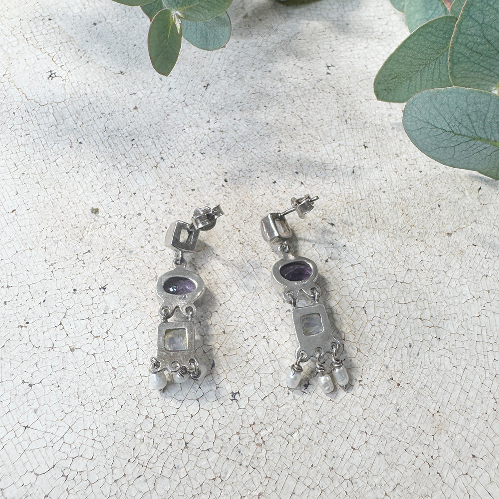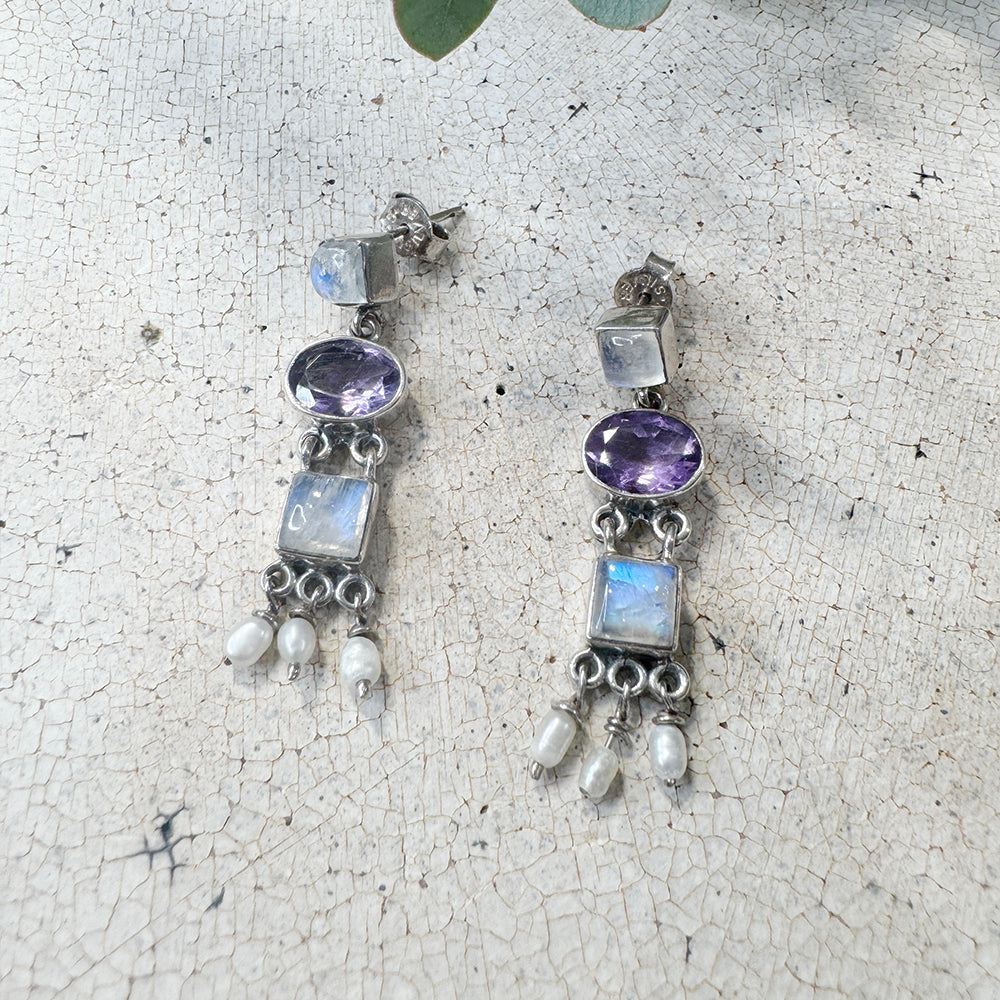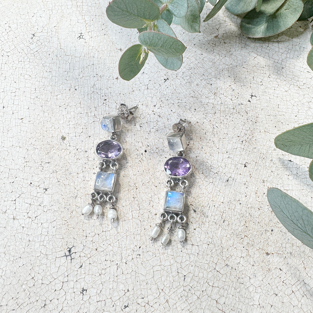 ムーンストーンとアメジストの天然石が連なっているデザインの揺れる